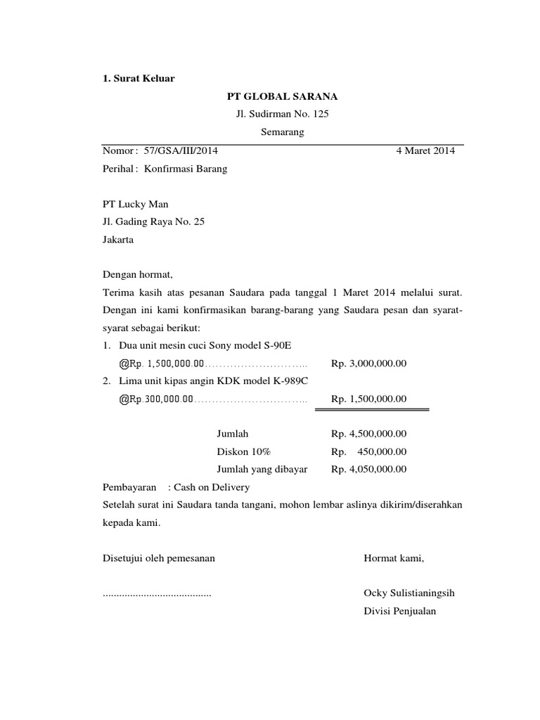 Contoh Surat Masuk Dan Surat Keluar from imgv2-2-f.scribdassets.com Contoh surat niaga pengertian jenis struktur fungsi dan cirinya. No deskripsi barang jml keterangan. Sangat penting untuk memperkenalkan perusahaan anda kepada pihak yang akan menerima surat. Contoh surat pesanan barang yang baik benar sam berita. Contoh surat pengiriman barang yang baik sebagai referensi dan sumber informasi membuat surat pengiriman barang format profesional. Kebutuhan digital pada zaman sekarang memang semakin meningkat, sehingga membuat kebutuhan. Delivery order adalah dokumen yang berfungsi sebagai surat perintah penyerahan barang kepada pembawa surat tersebut, yang ditujukan kepada bagian yang menyimpan barang ( bagian gudang ) milik perusahaan atau bagian gudang perusahaan lain yang memiliki konsensus dengan perusahaan. Surat pemesanan bahasa inggris order letter jujubandung.